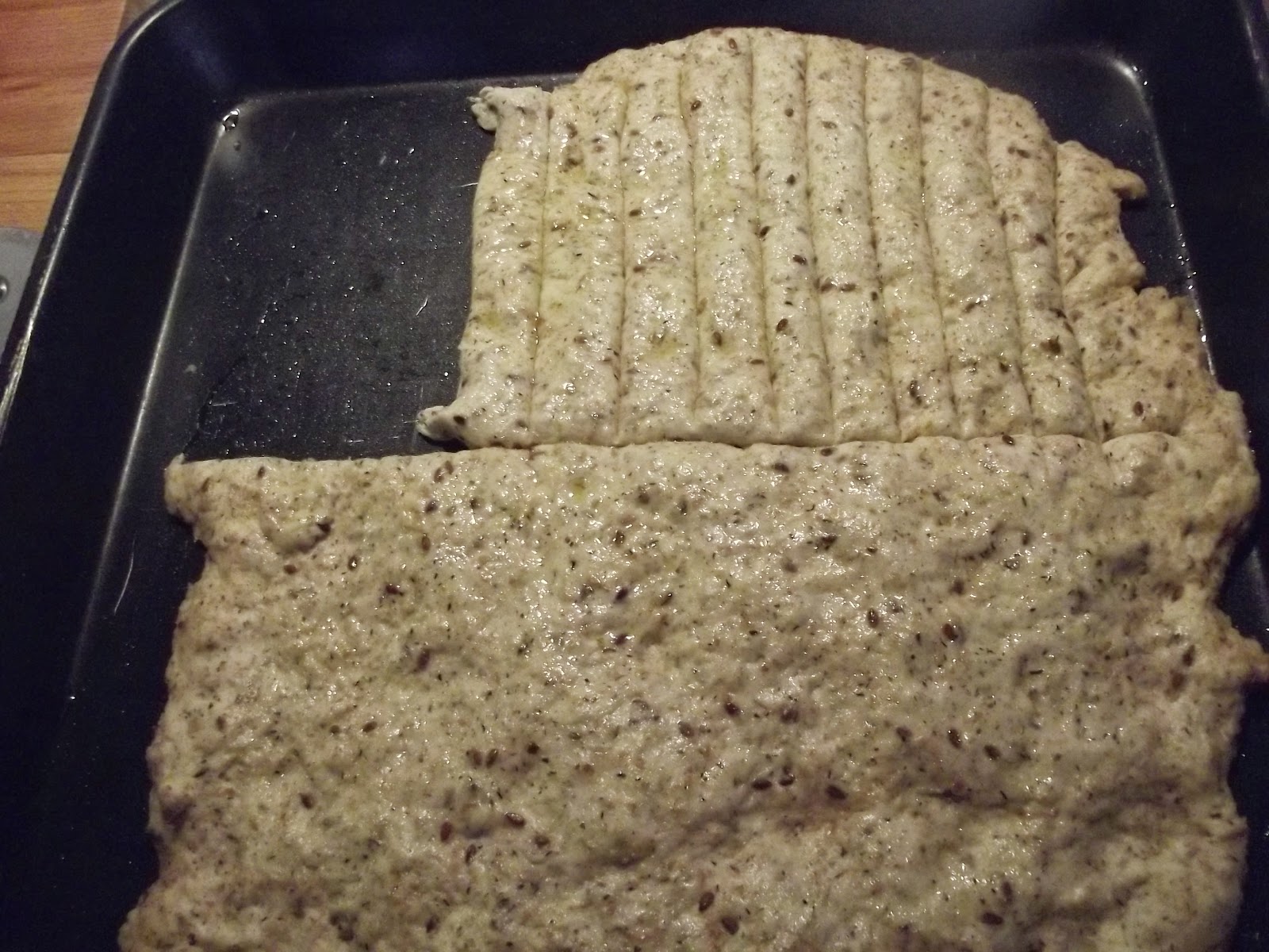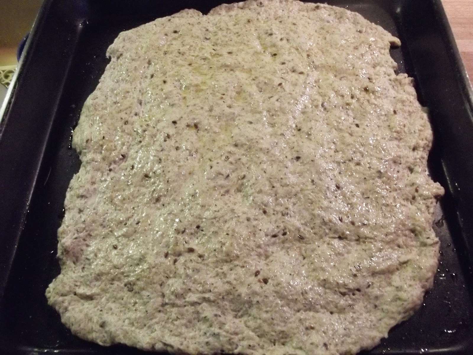 Lasciate lievitare per due ore, poi stendete l'impasto in una teglia rettangolare grande, ungetelo con dell'olio evo e lasciatelo lievitare per un'altra ora.